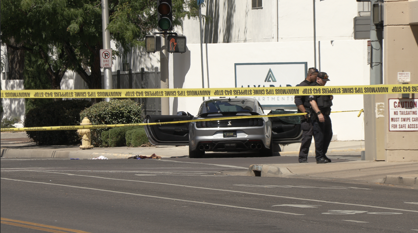 On scene, we observed a silver Mustang and a pile of bloody clothing belonging to a male individual. The scene also seems to be located at the corner of 6th/Lead SW.