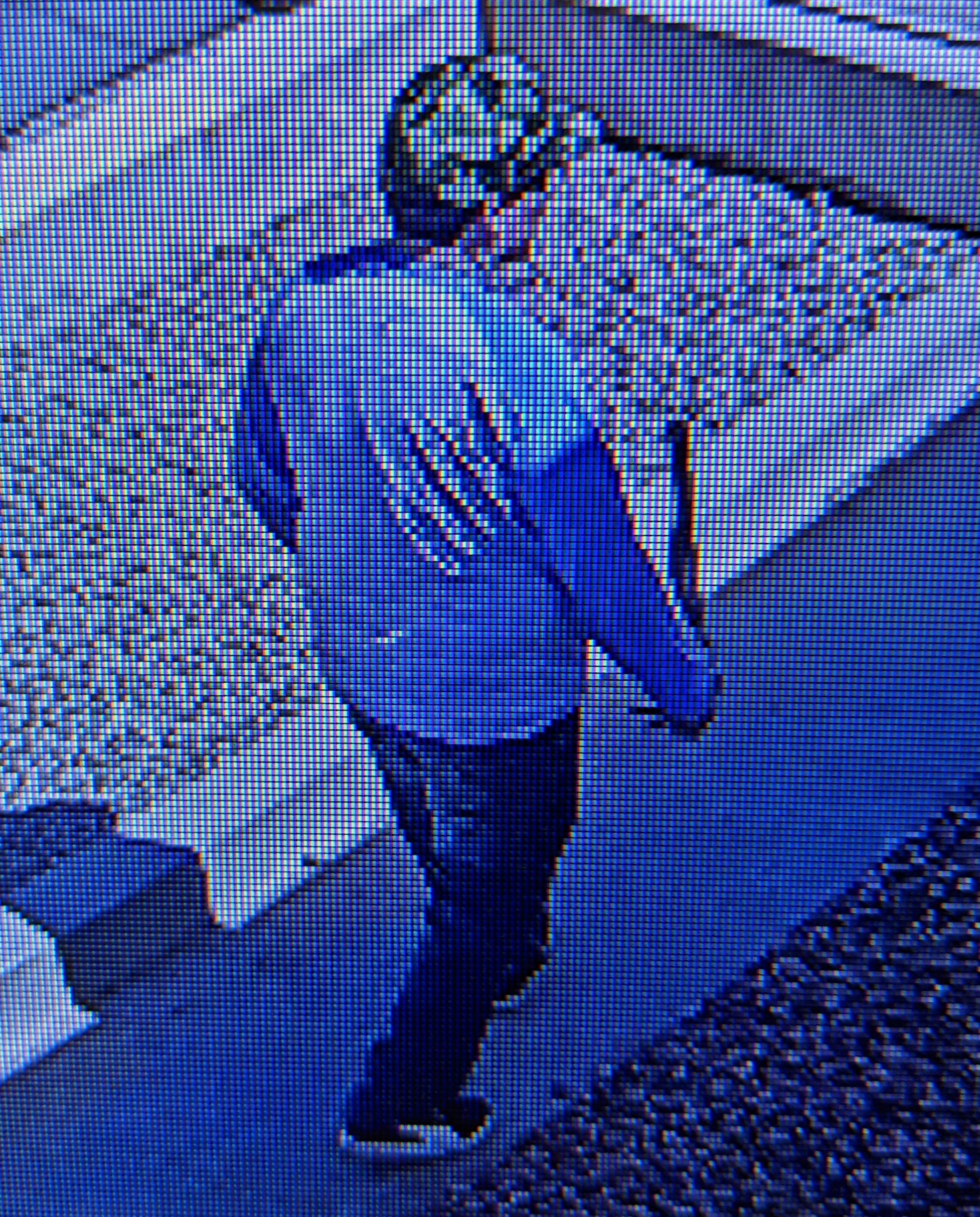 Clothing: Dark baseball cap, sunglasses, surgical mask, blue and white FILA long-sleeve shirt, blue jeans, dark shoes.