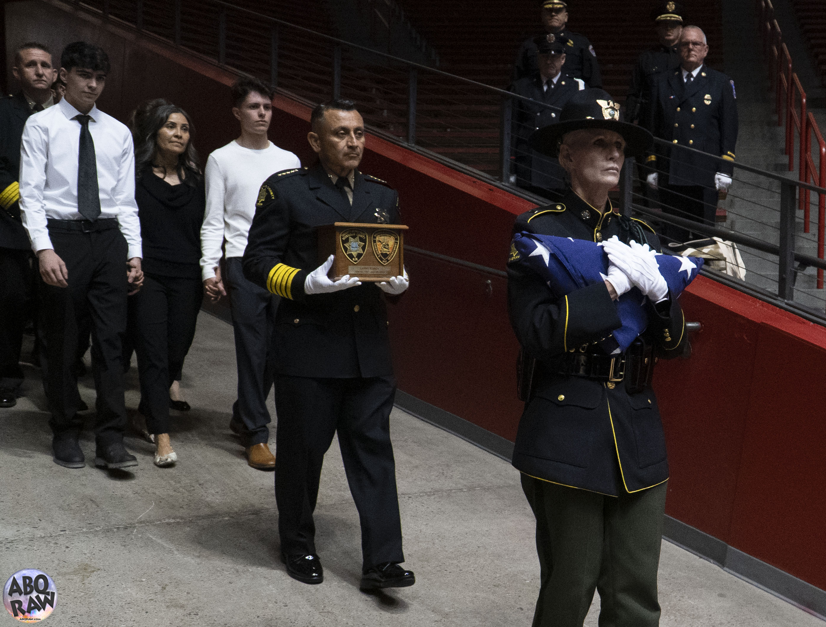 A Bernalillo County Honor Guard member takes a folded flag into The Pit for a memorial of Undersheriff Larry Koren. In the back is Sheriff Manny Gonzales III carrying the urn with the remains of Undersheriff Koren.