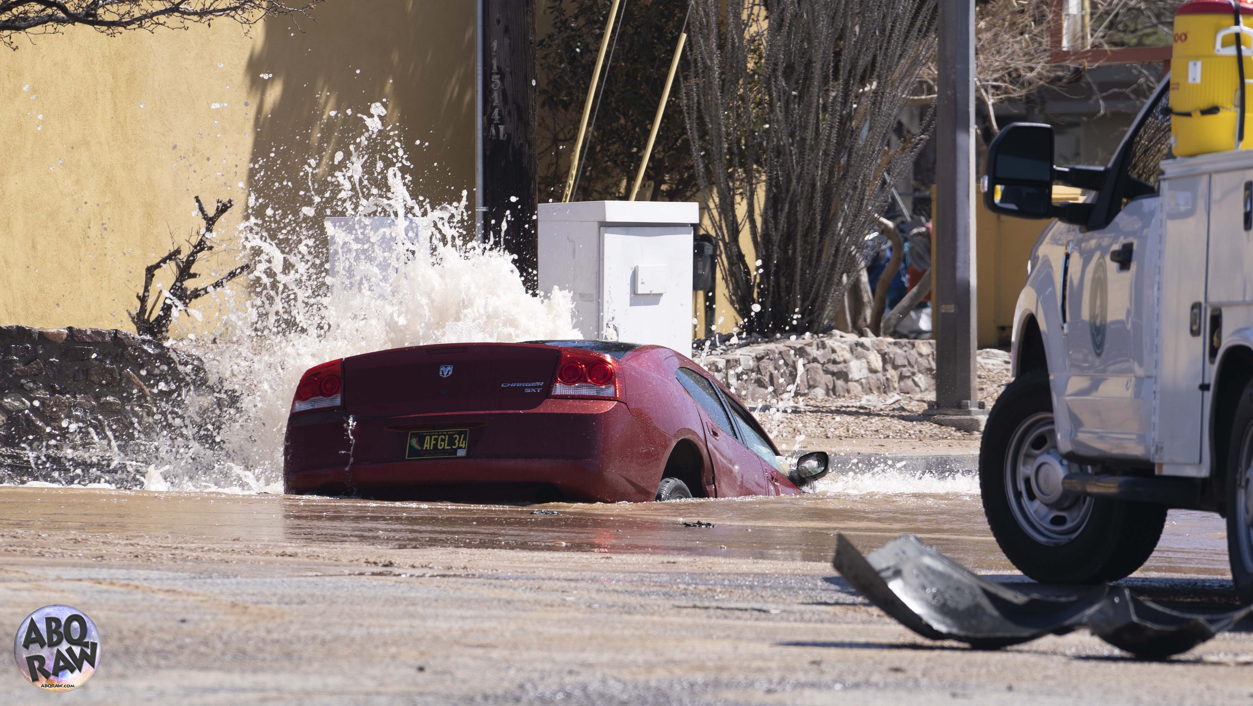 Albuquerque Fire Rescue and Albuquerque Police were dispatched to the intersection of University and Menaul Blvd NE about a motor vehicle crash with injuries. A red Dodge Charger hit a fire hydrant and it caused a sink hole which swallowed the car.