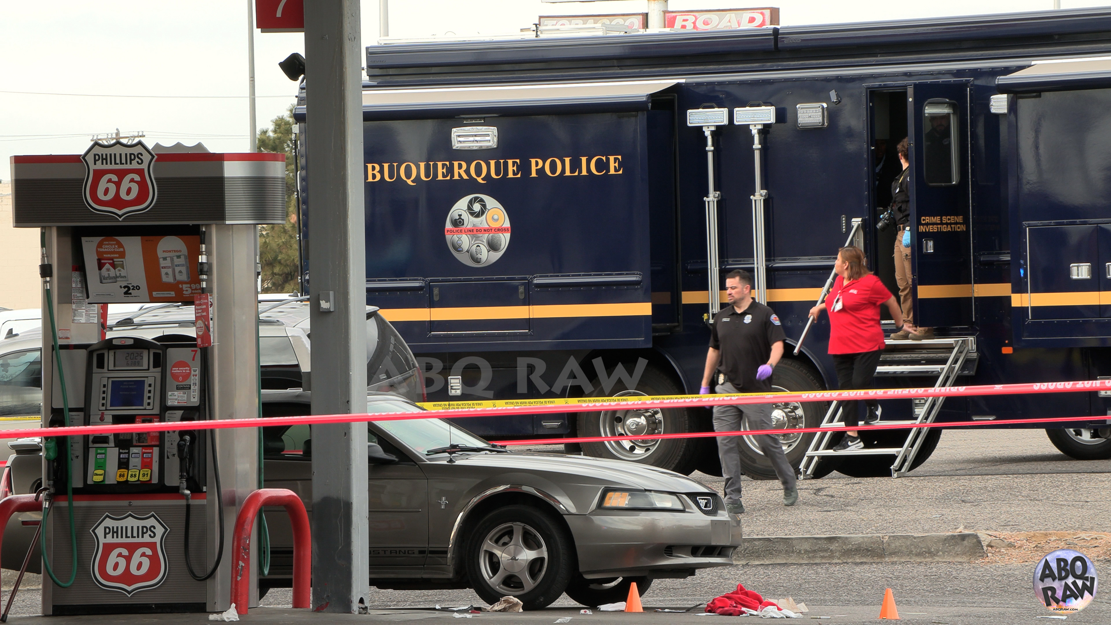 The shooting appeared to happen on the north side of the gas station in front of an older model Ford Mustang. Bloody clothing from one of the victims could be seen in front of the vehicle. CSI investigators and homicide detectives were observed investigating the scene.