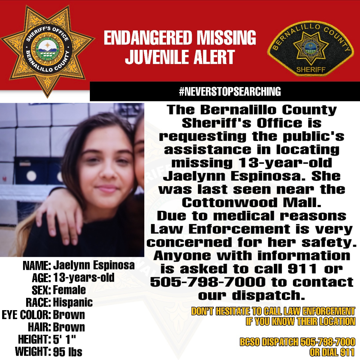 The Bernalillo County Sheriff’s Office is requesting the public’s assistance in locating missing 13-year-old Jaelynn Espinosa. She was last seen near the Cottonwood Mall. Due to medical reasons Law Enforcement is very concerned for her safety. Anyone with information is asked to call 911 or 505-798-7000 to contact BCSO dispatch.