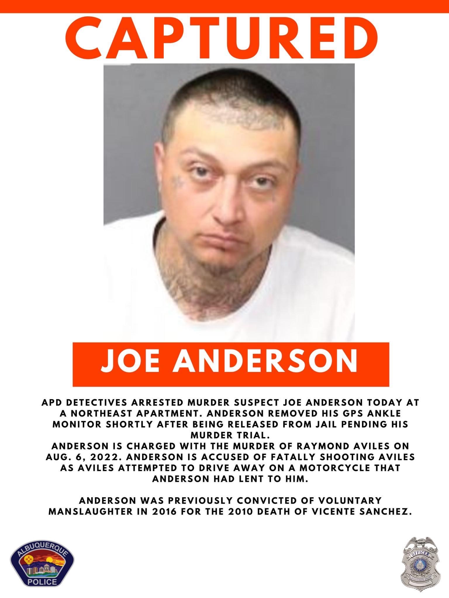 Albuquerque – Earlier today APD detectives arrested murder suspect Joe Anderson at an apartment in the northeast part of town. Previously Anderson cut off his GPS ankle monitor shortly after being released from jail pending his murder trial.