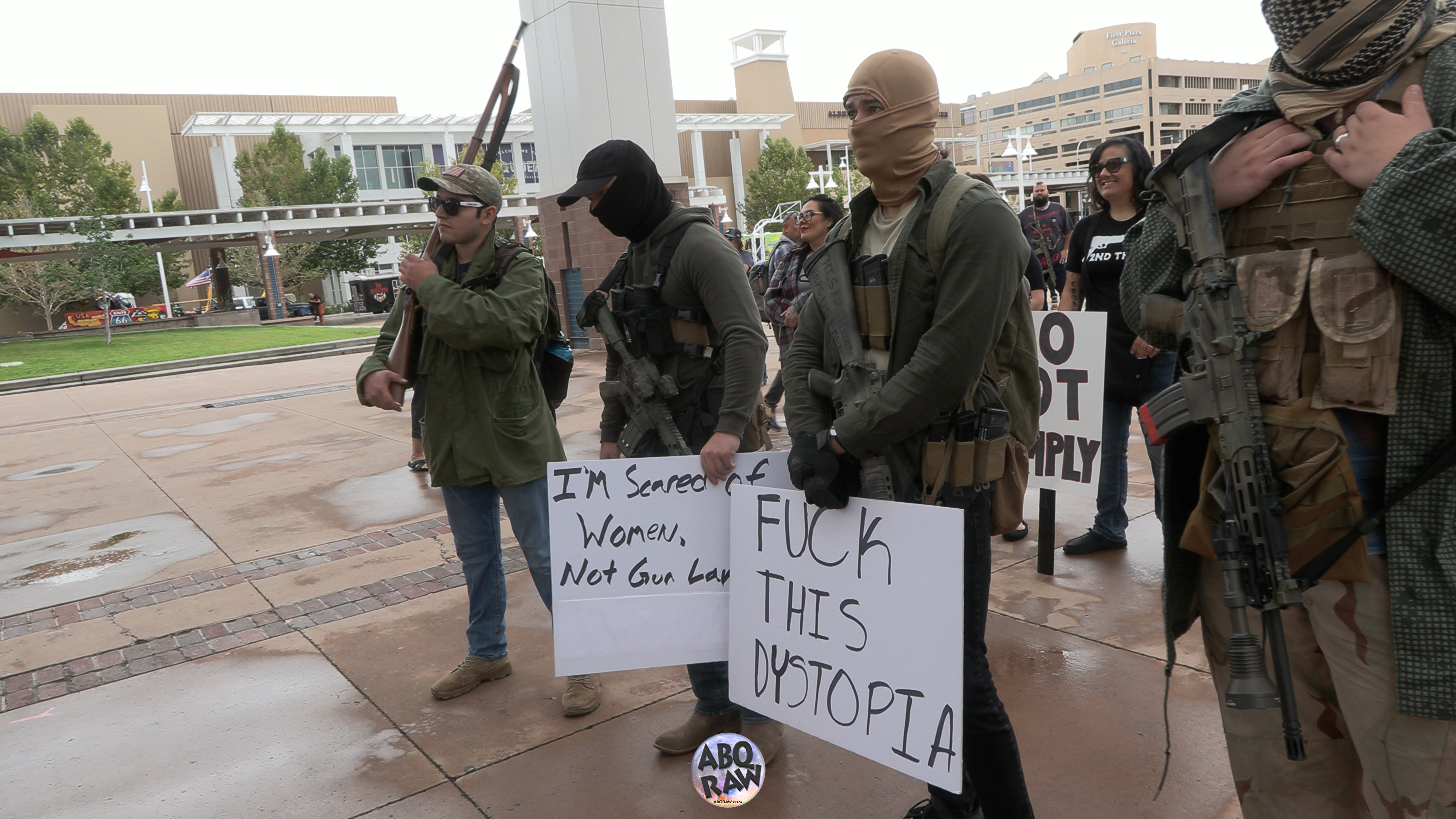 At its peak over 75 people came to Civic Plaza to hold signs and speak to the crowd. Some open carried their firearms ranging from pistols, long rifles, and even a 1700’s era musket was seen. ABQ RAW noticed the signage usually posted throughout civic plaza announcing this is a school zone was missing. In 2020, Mayor Tim Keller made Civic Plaza a no weapons zone and three people were cited during a Black Lives Matter protest at Civic Plaza. All those signs had been removed before today’s event.