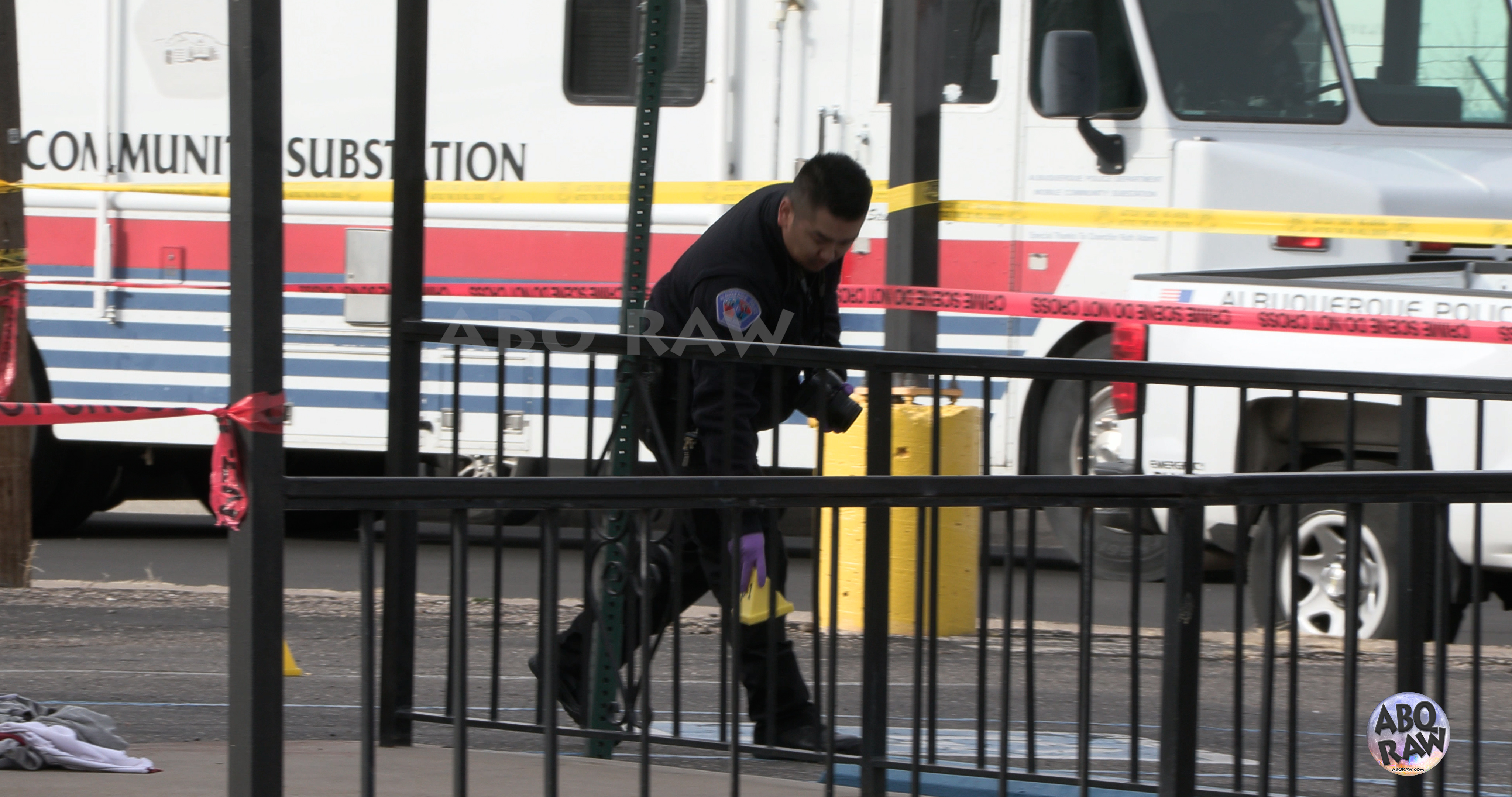 We arrived on scene to see APD gathering evidence and documenting the scene. There were two piles of clothing from the shooting victims with blood on the sidewalk.