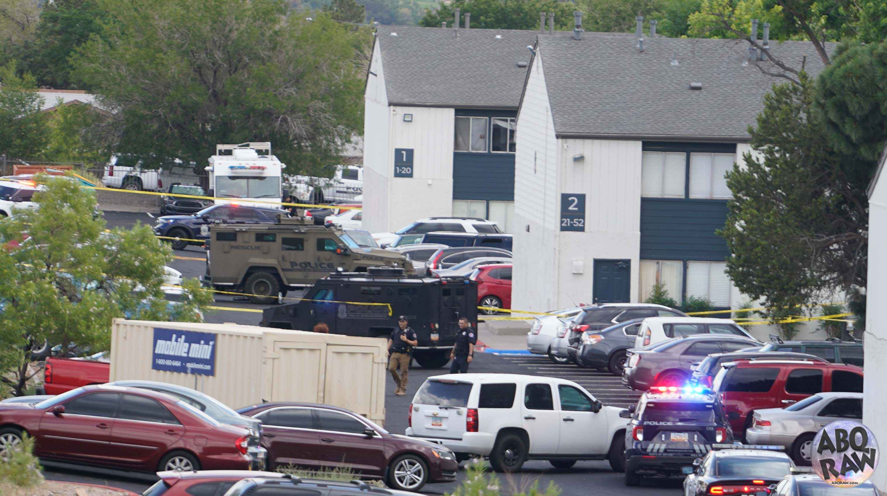Around 3:30PM, APD’s civilian PIO informed the media that the SWAT team had been activated to take an individual into custody in the area of 557 Tramway Blvd. NE. Officers were trying to arrest a man who had an active arrest warrant. The suspect was barricaded inside an Copper Ridge Apartment complex and he was refusing orders to surrender peacefully. The Copper Ridge Apartments have been the scene of many violent incidents, including at least one homicide.