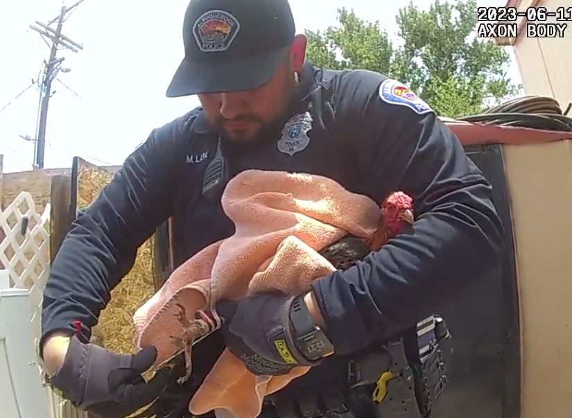 Today around 1PM, the Albuquerque Police Department responded to 530 Utah St. SE in reference to reports of an illegal cock fighting ring happening at the residence. According to APD, when officers arrived at the home approximately 20 people on scene fled in various directions. In the body camera video it appears the group of men who all appear to be in their late teens and early 20s.