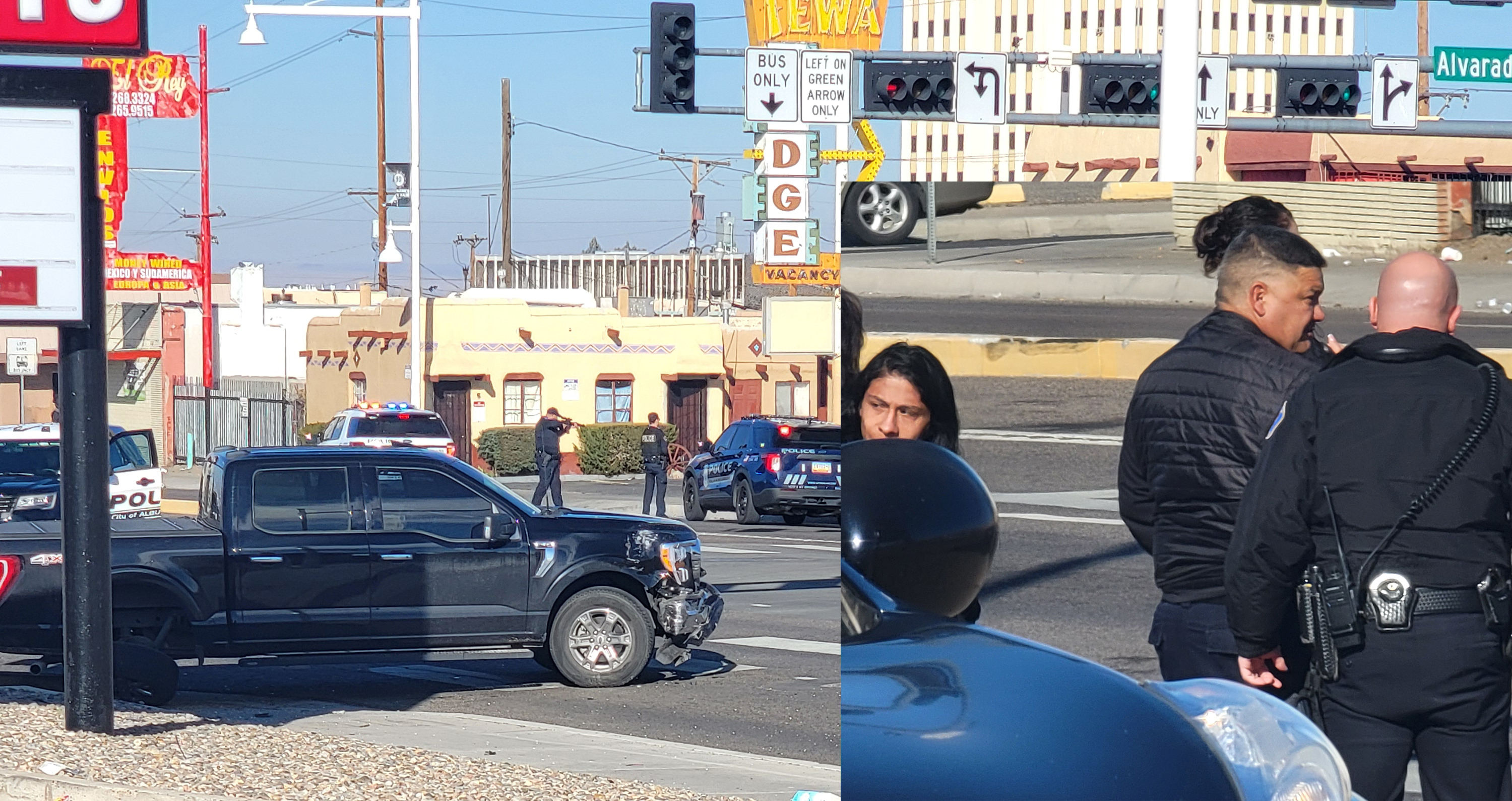 APD Police Chief Harold Medina’s truck (left) showing front end damage while officers focus on the Tewa Lodge for a suspect. The photo overlay (right) is Chief Medina talking with officers at the scene.